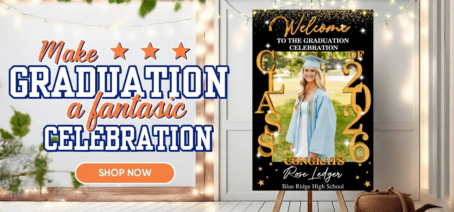 We offer a wide range of personalized graduation products, including custom banners, backdrop, welcome signs for graduation parties, lawn signs, sashes, face fun and more. Each item can be customized to celebrate your graduate's big achievement!