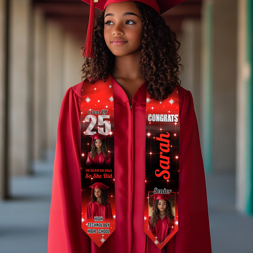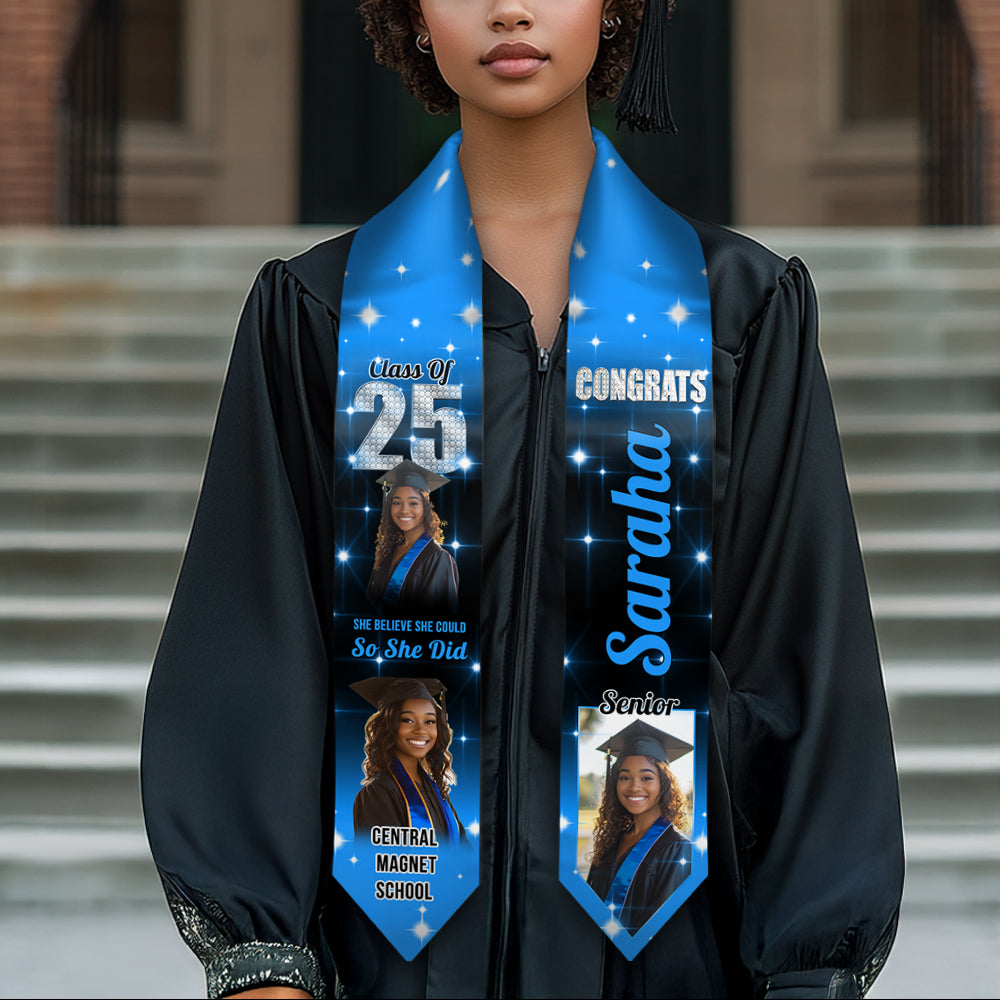 Why settle for ordinary when you can have extraordinary? Our custom grad stoles are tailored to reflect your personal journey. Add your name, graduation year, school, or even a photo to create a stole that’s uniquely yours. Unlike generic stoles, ours tell your story, making it a cherished keepsake for years to come.