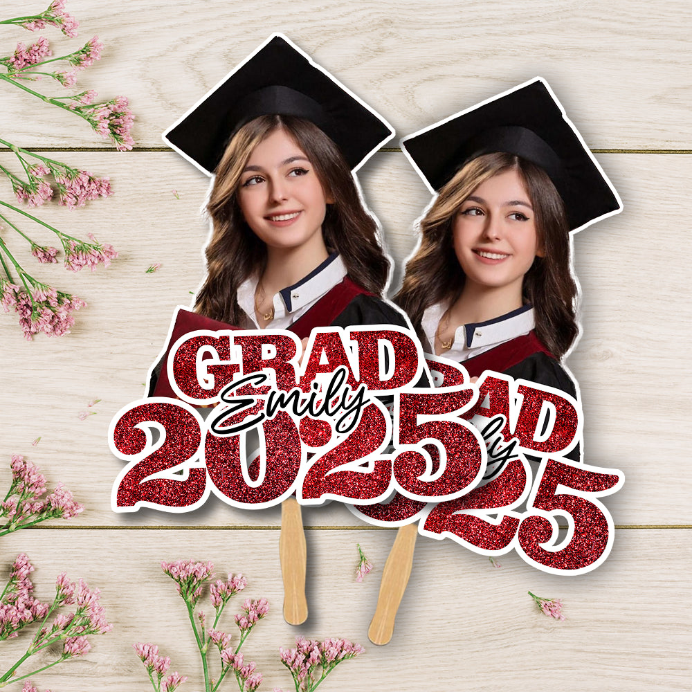 Glitter Graduation Face Fans With Wooden Handle - Fans Faces on a hold graduation - Fan Class Of 2025