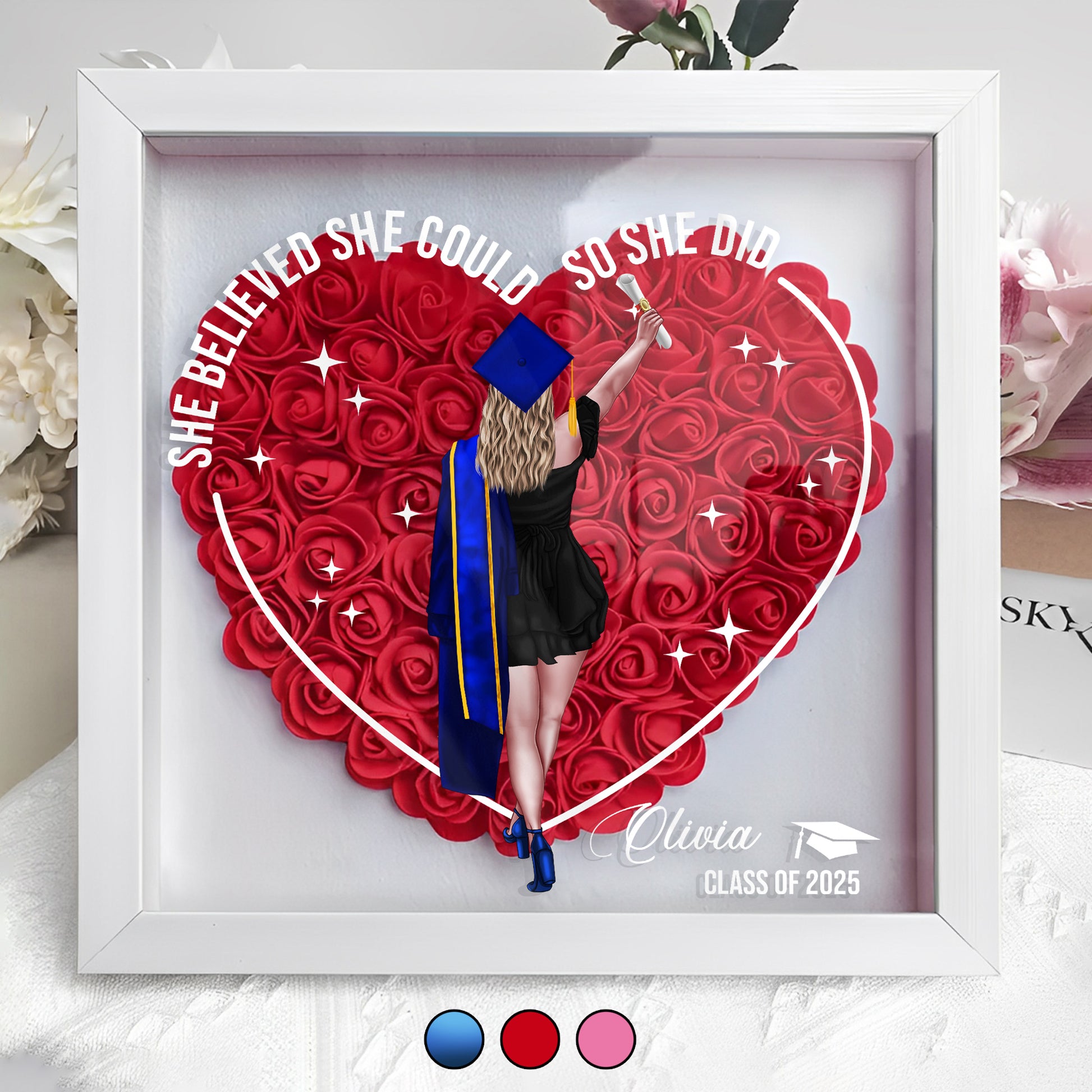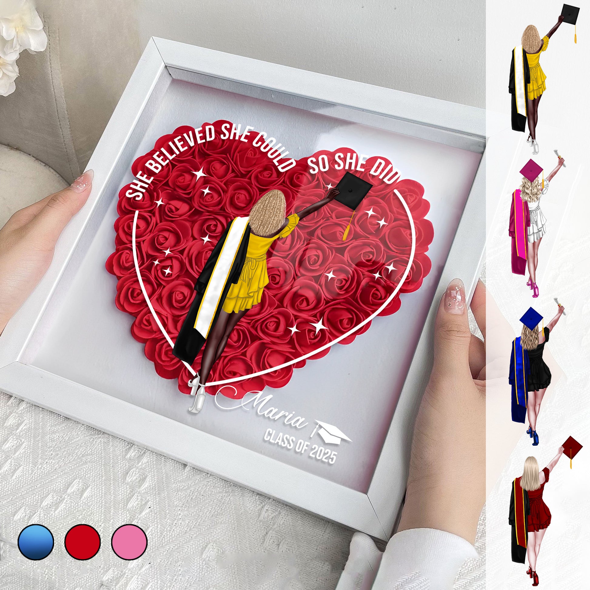 Graduation Class Of 2025 Heart Shaped Flower - She Believed She Could So She Did v2 - Personalized Flower Shadow Box