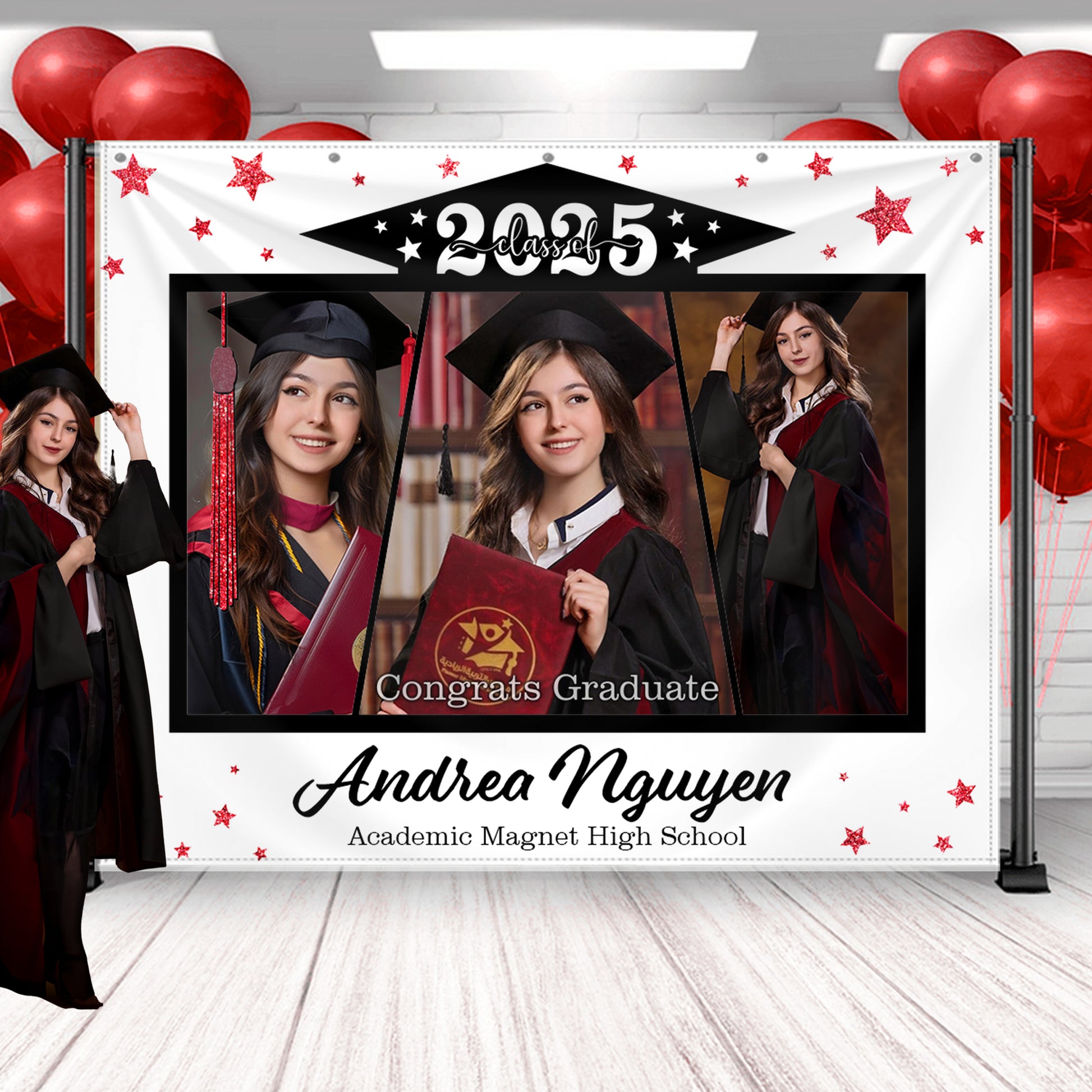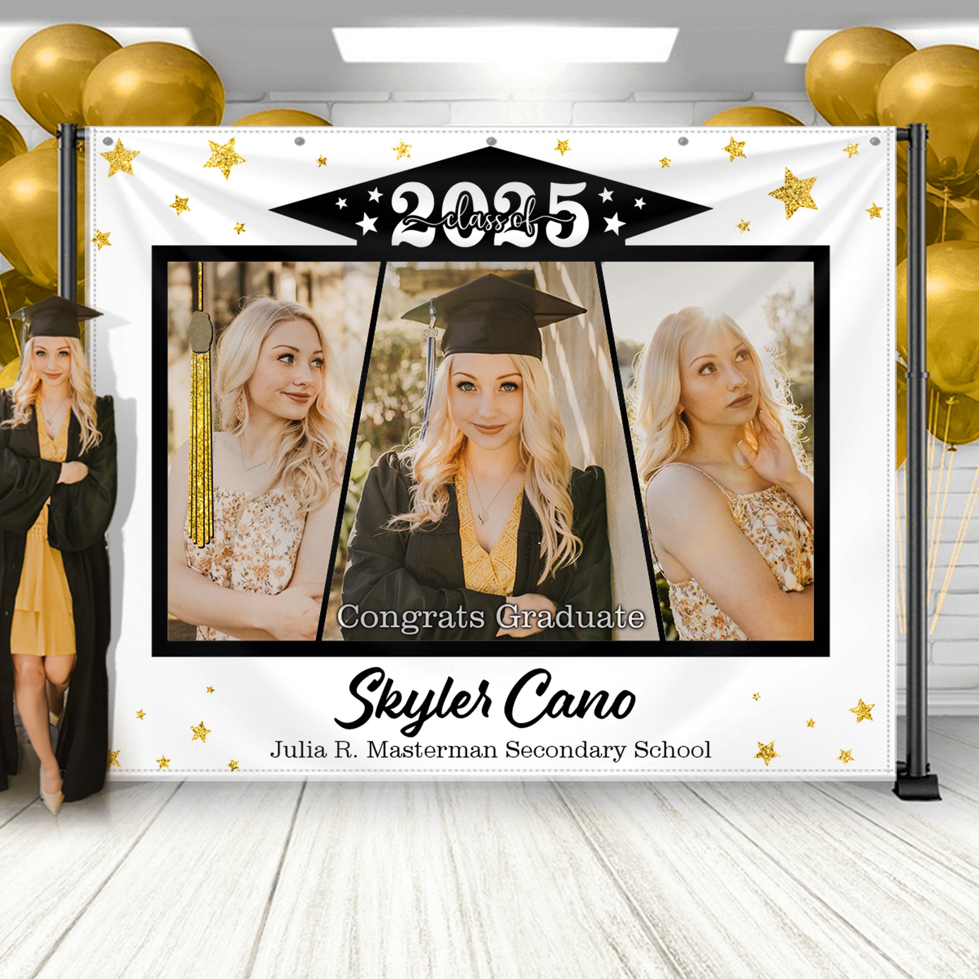 Personalize Graduation Backdrop 2025. Celebrate their achievement with our "Custom Photo Congratulations Class of 2025 Graduation" Backdrop. The perfect gift for Graduation Day, this backdrop allows you to personalize it with their photo, making it a meaningful and inspirational keepsake. Commemorate their hard work and success!